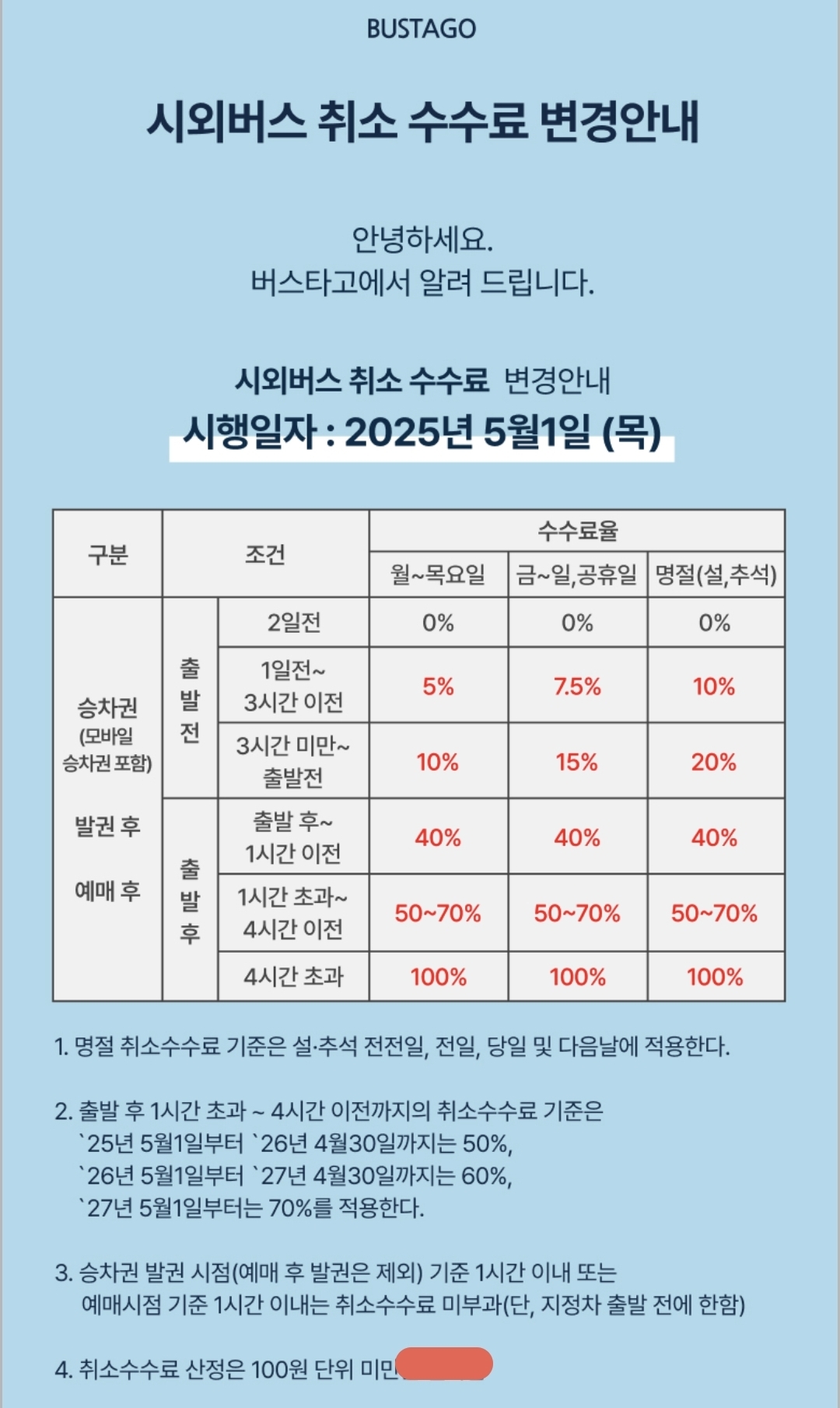 시외버스 취소 수수료가 인상됐다는 기사를 봤는데, 참고하시면 좋을 거 같아요.